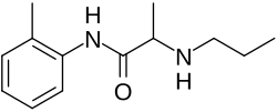 Prilocaine (/ˈpraɪləˌkeɪn/[1]) is a local anesthetic of the amino amide type first prepared by Claes Tegner and Nils Löfgren. In its injectable form (trade name Citanest), it is often used in dentistry. It is also often combined with lidocaine as a topical preparation for dermal anesthesia (lidocaine/prilocaine or EMLA), for treatment of conditions like paresthesia. As it has low cardiac toxicity, it is commonly used for intravenous regional anaesthesia (IVRA).