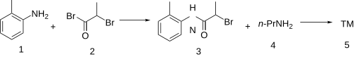 The amidation between o-toluidine [95-53-4] (1) and 2-bromopropionyl bromide [563-76-8] (2) leads to 2-bromo-N-(2-methylphenyl)propanamide [19397-79-6] (3). Displacement of the remaining halide with propylamine [107-10-8] (4) completed the synthesis of prilocaine (5).