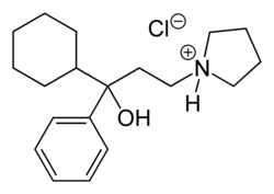 Procyclidine is an anticholinergic drug principally used for the treatment of drug-induced parkinsonism, akathisia and acute dystonia, Parkinson's disease, and idiopathic or secondary dystonia.