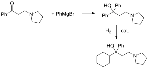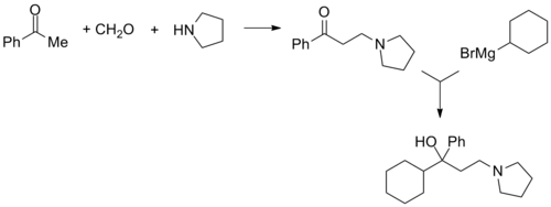 Procyclidine, 1-cyclohexyl-1-phenyl-3-pyrrolidinopropan-1-ol, is synthesized in exactly the same manner as was seen for trihexyphenidyl, except this time the linear synthesis begins with the preparation of 3-(1-pyrrolidino)propiophenone.