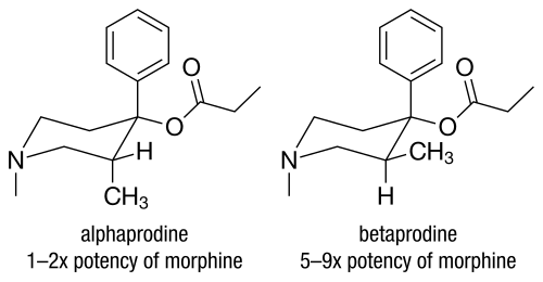There are two isomers of the trans form of prodine, alphaprodine and betaprodine. Both exhibit optical isomerism and alphaprodine and betaprodine are racemates.[3] Alphaprodine is closely related to desomorphine in steric configuration.[3] The cis form also has active isomers but none are used in medicine.[3][4] Betaprodine is around five times more potent than alphaprodine[5] but is metabolized more rapidly, and only alphaprodine was developed for medicinal use. It has similar activity to pethidine, but with a more rapid onset and shorter duration of effects.[6] Betaprodine produces more euphoria and side effects than alphaprodine at all dose levels, and it was found that 5 to 10 mg of betaprodine is equivalent to 25 to 40 mg of alphaprodine.[3]