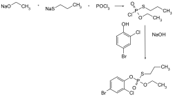 Profenofos can be synthesized by reacting phosphorus oxychloride with sodium ethoxide and sodium 1-propanethiolate, followed by treatment with 4-bromo-2-chlorophenol.[6]: 332