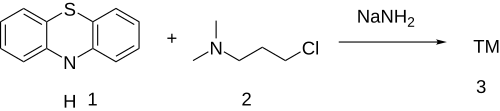 12. ^ Schmolka SJ, Zimmer H (1984). "N -Dimethylaminopropylation in a Solid-Liquid Two Phase System: Synthesis of Chlorpromazine, its Analogs, and Related Compounds". Synthesis. 1984 (1): 29–31. doi:10.1055/s-1984-30719. S2CID 95682513.
