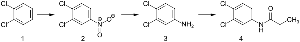 Propanil is made industrially by nitration of 1,2-dichlorobenzene (1) to give 1,2-dichloro-4-nitrobenzene (2), followed by hydrogenation of the nitro group with Raney nickel to give 3,4-dichloroaniline (3). Acylation of the amine with propanoyl chloride yields propanil (4).[10] The resulting product is white or brown crystals.[11]