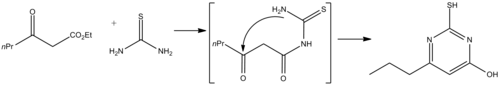Propylthiouracil can be prepared from ethyl 3-oxohexanoate and thiourea.[13]