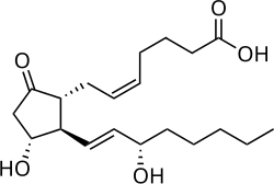 Prostaglandin E2 (PGE2), also known as dinoprostone, is a naturally occurring prostaglandin with oxytocic properties that is used as a medication.[2][3][4] Dinoprostone is used in labor induction, bleeding after delivery, termination of pregnancy, and in newborn babies to keep the ductus arteriosus open.[2][5] In babies it is used in those with congenital heart defects until surgery can be carried out.[5] It is also used to manage gestational trophoblastic disease.[4] It may be used within the vagina or by injection into a vein.[2][6]