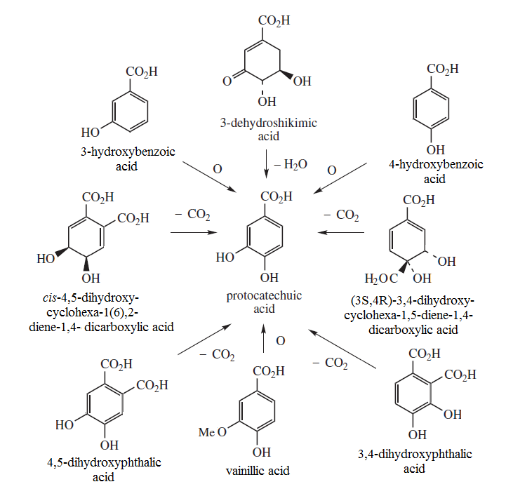 • The enzyme protocatechuate decarboxylase uses 3,4-dihydroxybenzoate to produce catechol and CO2.