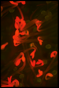 In spite of numerous past attempts to find the mutant that overaccumulates protochlorophyllide under usual conditions, only one such gene (flu) is currently (2009) known. Flu (first described in [3]) is a nuclear-encoded, chloroplast-located protein that appears containing only protein-protein interaction sites. It is currently not known which other proteins interact through this linker. The regulatory protein is a transmembrane protein that is located in the thylakoid membrane. Later, it was discovered that Tigrina mutants in barley, known a long time ago, are also mutated in the same gene.[9] It is not obvious why no mutants of any other gene were observed; maybe mutations in other proteins, involved into the regulatory chain, are fatal. Flu is a single gene, not a member of the gene family.