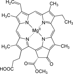 Protochlorophyllide,[1] or monovinyl protochlorophyllide, is an intermediate in the biosynthesis of chlorophyll a. It lacks the phytol side-chain of chlorophyll and the reduced pyrrole in ring D.[2] Protochlorophyllide is highly fluorescent; mutants that accumulate it glow red if irradiated with blue light.[3] In angiosperms, the later steps which convert protochlorophyllide to chlorophyll are light-dependent, and such plants are pale (chlorotic) if grown in the darkness. Gymnosperms, algae, and photosynthetic bacteria have another, light-independent enzyme and grow green in the darkness as well.