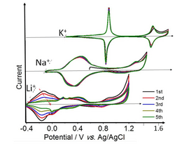 Prussian blue (PB) has been studied for its applications in electrochemical energy storage since 1978.[58] Prussian blue proper (the Fe-Fe solid) shows two well-defined reversible redox transitions in K+ solutions. Weakly solvated potassium ions (as well as Rb+ and Cs+, not shown) have the solvated radius, which fits the framework of Prussian Blue. On the other hand, the sizes of solvated Na+ and Li+ are too large for the PB cavity, and the intercalation of these ions is hindered and much slower. The low and high voltage sets of peaks in the cyclic voltammetry correspond to 1 and 2/3 electron per Fe atom, respectively.[59] The high voltage set is due to the Fe3+/Fe2+ transition at the low-spin Fe ions coordinated to C-atoms. The low-voltage set is due to high-spin Fe ion coordinated to N-atoms.[60][61][62]