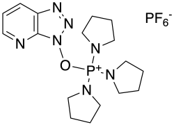 PyAOP ((7-azabenzotriazol-1-yloxy)tripyrrolidinophosphonium hexafluorophosphate) is a reagent used to prepare amides from carboxylic acids and amines in the context of peptide synthesis.[1] It can be prepared from 1-hydroxy-7-azabenzotriazole (HOAt) and a chlorophosphonium reagent under basic conditions.[2] It is a derivative of the HOAt family of amide bond forming reagents. It is preferred over HATU, because it does not engage in side reactions with the N-terminus of the peptide.[3] Compared to the HOBt-containing analog PyBOP, PyAOP is more reactive due to the additional nitrogen in the fused pyridine ring of the HOAt moiety.[4] Thermal hazard analysis by differential scanning calorimetry (DSC) shows PyAOP is potentially explosive.[5]