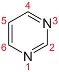 Pyrimidine (C4H4N2; /pɪˈrɪ.mɪˌdiːn, paɪˈrɪ.mɪˌdiːn/) is an aromatic, heterocyclic, organic compound similar to pyridine (C5H5N).[3] One of the three diazines (six-membered heterocyclics with two nitrogen atoms in the ring), it has nitrogen atoms at positions 1 and 3 in the ring.[4]: 250 The other diazines are pyrazine (nitrogen atoms at the 1 and 4 positions) and pyridazine (nitrogen atoms at the 1 and 2 positions).