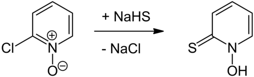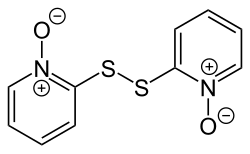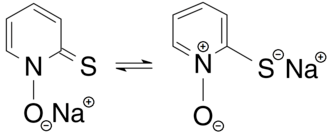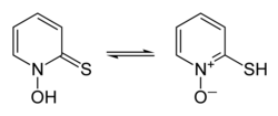 5NOS, chosen as an abbreviation of pyridinethione, and found in the Persian shallot.[4] It exists as a pair of tautomers, the major form being the thione 1-hydroxy-2(1H)-pyridinethione and the minor form being the thiol 2-mercaptopyridine N-oxide; it crystallises in the thione form.[5] It is usually prepared from either 2-bromopyridine,[1] 2-chloropyridine,[6][7] or 2-chloropyridine N-oxide,[8] and is commercially available as both the neutral compound and its sodium salt.[1] It is used to prepare zinc pyrithione,[9][10] which is used primarily to treat dandruff and seborrhoeic dermatitis in medicated shampoos,[11][12] though is also an anti-fouling agent in paints.[13]