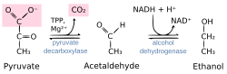 Pyruvate decarboxylase is an enzyme (EC 4.1.1.1) that catalyses the decarboxylation of pyruvic acid to acetaldehyde. It is also called 2-oxo-acid carboxylase, alpha-ketoacid carboxylase, and pyruvic decarboxylase.[1] In anaerobic conditions, this enzyme participates in the fermentation process that occurs in yeast, especially of the genus Saccharomyces, to produce ethanol by fermentation. It is also present in some species of fish (including goldfish and carp) where it permits the fish to perform ethanol fermentation (along with lactic acid fermentation) when oxygen is scarce.[2] Pyruvate decarboxylase starts this process by converting pyruvate into acetaldehyde and carbon dioxide.[3] Pyruvate decarboxylase depends on cofactors thiamine pyrophosphate (TPP) and magnesium. This enzyme should not be mistaken for the unrelated enzyme pyruvate dehydrogenase, an oxidoreductase (EC 1.2.4.1), that catalyzes the oxidative decarboxylation of pyruvate to acetyl-CoA.