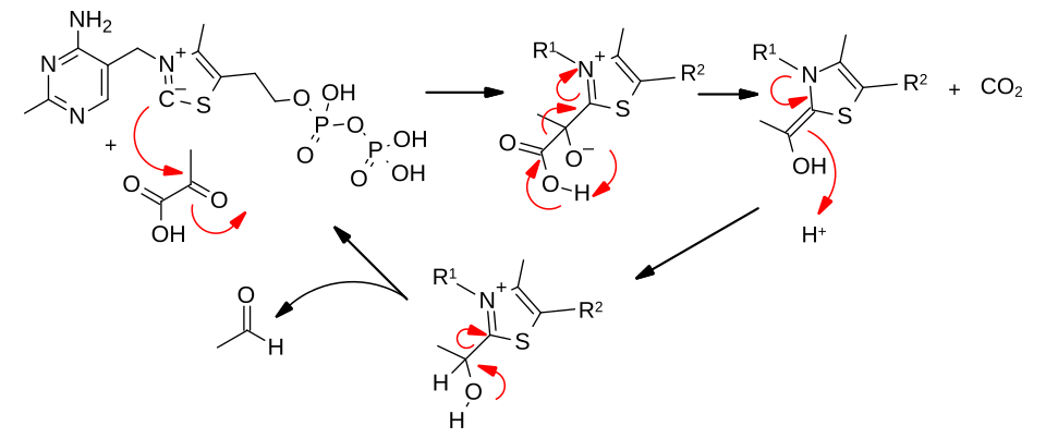 pyruvate + thiamine pyrophosphate (TPP) → hydroxyethyl-TPP + CO2