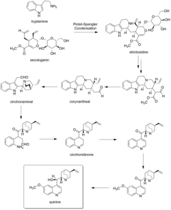 In the first step of quinine biosynthesis, the enzyme strictosidine synthase catalyzes a stereoselective Pictet–Spengler reaction between tryptamine and secologanin to yield strictosidine.[48][49] Suitable modification of strictosidine leads to an aldehyde. Hydrolysis and decarboxylation would initially remove one carbon from the iridoid portion and produce corynantheal. Then the tryptamine side-chain were cleaved adjacent to the nitrogen, and this nitrogen was then bonded to the acetaldehyde function to yield cinchonaminal. Ring opening in the indole heterocyclic ring could generate new amine and keto functions. The new quinoline heterocycle would then be formed by combining this amine with the aldehyde produced in the tryptamine side-chain cleavage, giving cinchonidinone. For the last step, hydroxylation and methylation gives quinine.[50][51]