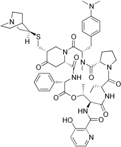 Quinupristin is a streptogramin B antibiotic, used in combination with dalfopristin under the trade name Synercid.[1] It has activity against Gram-positive and atypical bacteria but not Gram-negative bacteria. It inhibits bacterial protein synthesis. The combination of quinupristin and dalfopristin is not active against Enterococcus faecalis and needs to be given in combination with other antibacterials for mixed infections that involve Gram-negative organisms.