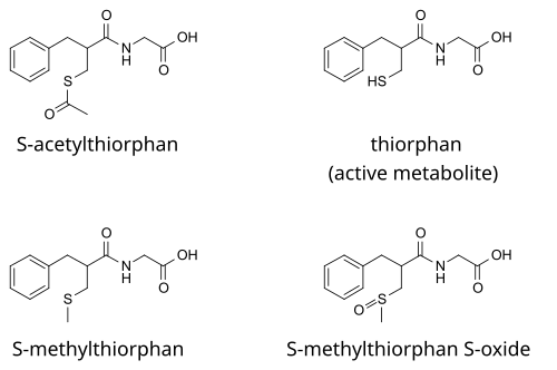 Thiorphan is further metabolized to inactive metabolites such as the methyl thioether and the methyl sulfoxide. Both active and inactive metabolites are excreted, mostly via the kidney (81.4%), and to a lesser extent via the feces (8%).[10]