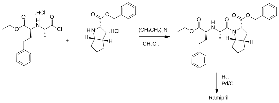 The penultimate step in the synthesis of ramipril combines an alanine derivative with a (S,S,S)-2-azabicyclo-[3.3.0]-octane-3-carboxylic acid protected as its benzyl ester.[20] In the original patented route, these components were obtained by a multi-step process.[21]