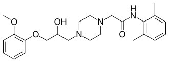 Ranolazine is used to treat chronic angina.[9] It may be used concomitantly with β blockers, nitrates, calcium channel blockers, antiplatelet therapy, lipid-lowering therapy, ACE inhibitors, and angiotensin receptor blockers.[10] It is also effective at preventing atrial fibrillation, and has been studied as monotherapy as well as in combination with other medications used to treat irregular heartbeat.[11][12]