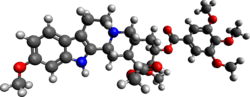 Reserpine is a drug that is used for the treatment of high blood pressure, usually in combination with a thiazide diuretic or vasodilator.[1] Large clinical trials have shown that combined treatment with reserpine plus a thiazide diuretic reduces mortality of people with hypertension. Although the use of reserpine as a solo drug has declined since it was first approved by the FDA in 1955,[2] the combined use of reserpine and a thiazide diuretic or vasodilator is still recommended in patients who do not achieve adequate lowering of blood pressure with first-line drug treatment alone.[3][4][5] The reserpine-hydrochlorothiazide combo pill was the 17th most commonly prescribed of the 43 combination antihypertensive pills available in 2012.[6]