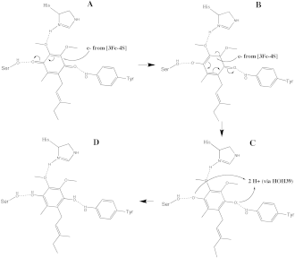 The O1 carbonyl oxygen of ubiquinone is oriented at the active site (image 4) by hydrogen bond interactions with Tyr83 of subunit D. The presence of electrons in the [3Fe-4S] iron sulphur cluster induces the movement of ubiquinone into a second orientation. This facilitates a second hydrogen bond interaction between the O4 carbonyl group of ubiquinone and Ser27 of subunit C. Following the first single electron reduction step, a semiquinone radical species is formed. The second electron arrives from the [3Fe-4S] cluster to provide full reduction of the ubiquinone to ubiquinol. This mechanism of the ubiquinone reduction is shown in image 8.