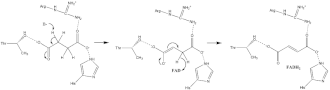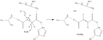 Much is known about the succinate oxidation mechanism, which involves the transfer of a proton and a hydride. A combination of mutagenesis and structural analysis identifies Arg-286 of the SDHA subunit (E. coli numbering) as the proton shuttle. Crystal structures of the enzymes from multiple organisms shows that this is well poised for the proton transfer step. Thereafter, there are two possible elimination mechanisms: E2 or E1cb. In the E2 elimination, the mechanism is concerted. The basic residue or cofactor deprotonates the alpha carbon, and FAD accepts the hydride from the beta carbon, oxidizing the bound succinate to fumarate—refer to image 6. In E1cb, an enolate intermediate is formed, shown in image 7, before FAD accepts the hydride. Further research is required to determine which elimination mechanism succinate undergoes in Succinate Dehydrogenase. Oxidized fumarate, now loosely bound to the active site, is free to exit the protein.