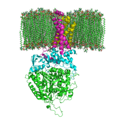 Mitochondrial and many bacterial SQRs are composed of four structurally different subunits: two hydrophilic and two hydrophobic. The first two subunits, a flavoprotein (SDHA) and an iron-sulfur protein (SDHB), form a hydrophilic head where enzymatic activity of the complex takes place. SDHA contains a covalently attached flavin adenine dinucleotide (FAD) cofactor and the succinate binding site and SDHB contains three iron-sulfur clusters: [2Fe-2S], [4Fe-4S], and [3Fe-4S]. The second two subunits are hydrophobic membrane anchor subunits, SDHC and SDHD. Human mitochondria contain two distinct isoforms of SDHA (Fp subunits type I and type II), these isoforms are also found in Ascaris suum and Caenorhabditis elegans.[3] The subunits form a membrane-bound cytochrome b complex with six transmembrane helices containing one heme b group and a ubiquinone-binding site. Two phospholipid molecules, one cardiolipin and one phosphatidylethanolamine, are also found in the SDHC and SDHD subunits (not shown in the image). They serve to occupy the hydrophobic space below the heme b. These subunits are displayed in the attached image. SDHA is green, SDHB is teal, SDHC is fuchsia, and SDHD is yellow. Around SDHC and SDHD is a phospholipid membrane with the intermembrane space at the top of the image.[4]