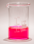 The solubility of rhodamine B in water varies by manufacturer, and has been reported as 8 g/L and ~15 g/L,[2] while solubility in alcohol (presumably ethanol) has been reported as 15 g/L.[nt 1] Chlorinated tap water decomposes rhodamine B. Rhodamine B solutions adsorb to plastics and should be kept in glass.[9] Rhodamine B is tunable around 610 nm when used as a laser dye.[10] Its luminescence quantum yield is 0.65 in basic ethanol,[11] 0.49 in ethanol,[12] 1.0,[13] and 0.68 in 94% ethanol.[14] The fluorescence yield is temperature dependent;[15] the compound is fluxional in that its excitability is in thermal equilibrium at room temperature.[16]