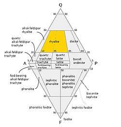 An extrusive igneous rock is classified as rhyolite when quartz constitutes 20% to 60% by volume of its total content of quartz, alkali feldspar, and plagioclase (QAPF) and alkali feldspar makes up 35% to 90% of its total feldspar content. Feldspathoids are not present. This makes rhyolite the extrusive equivalent of granite. However, while the IUGS recommends classifying volcanic rocks on the basis of their mineral composition whenever possible, volcanic rocks are often glassy or so fine-grained that mineral identification is impractical. The rock must then be classified chemically based on its content of silica and alkali metal oxides (K2O plus Na2O). Rhyolite is high in silica and total alkali metal oxides, placing it in the R field of the TAS diagram.[6][7][8][9]: 140–146