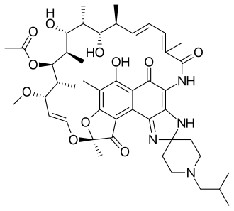 Rifabutin (Rfb) is an antibiotic used to treat tuberculosis and prevent and treat Mycobacterium avium complex.[1] It is typically only used in those who cannot tolerate rifampin such as people with HIV/AIDS on antiretrovirals.[1] For active tuberculosis it is used with other antimycobacterial medications.[1] For latent tuberculosis it may be used by itself when the exposure was with drug-resistant TB.[1]