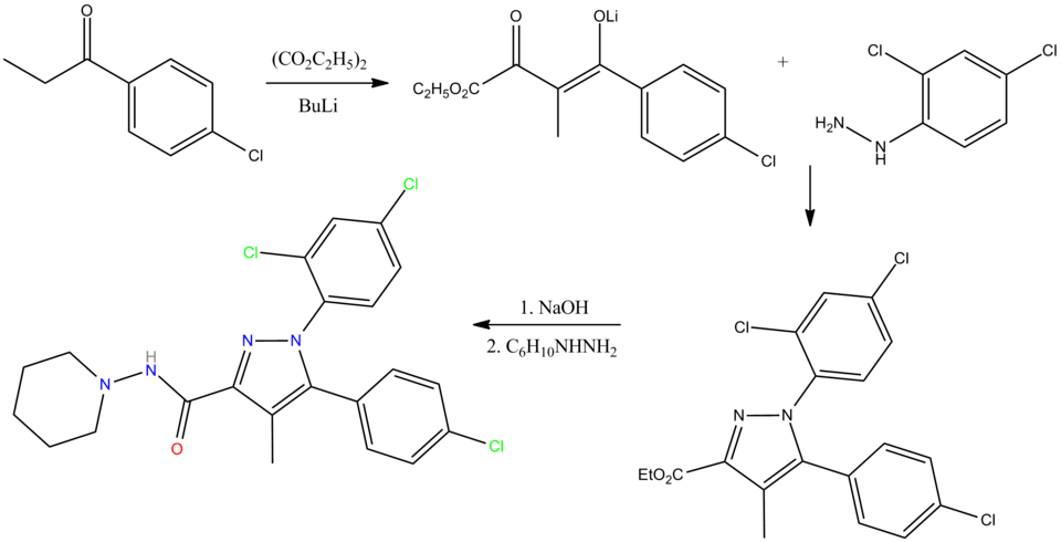 The chemical synthesis of rimonabant is described as follows:[18]