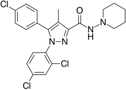 Rimonabant (also known as SR141716; trade names Acomplia, Zimulti)[3] is an anorectic antiobesity drug approved in Europe in 2006 but was withdrawn worldwide in 2008 due to serious neurological and psychiatric side effects; it was never approved in the United States.[1][2] Rimonabant is an inverse agonist for the cannabinoid receptor CB1 and was first-in-class.[4][5]