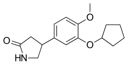 Rolipram is a selective phosphodiesterase-4 inhibitor discovered and developed by Schering AG as a potential antidepressant drug in the early 1990s.[2] It served as a prototype molecule for several companies' drug discovery and development efforts.[3]: 668ff Rolipram was discontinued after clinical trials showed that its therapeutic window was too narrow; it could not be dosed at high enough levels to be effective without causing significant gastrointestinal side effects.[3]: 668