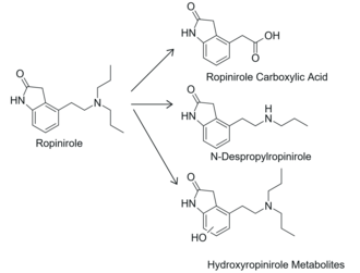 The major metabolic pathway in humans is via N-depropylation;[55] the N-despropyl metabolite accounts for 35 to 40% of the oral dose in human urine. 7-hydroxy ropinirole, the only metabolite of ropinirole that is thought to have significant dopamine agonist activity in vivo, [55] accounts for less than 5% of the dose. The potential contribution of 7-hydroxy ropinirole to the clinical effects of the parent drug is unknown.