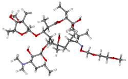Roxithromycin is a semi-synthetic macrolide antibiotic used to treat respiratory tract, urinary and soft tissue infections. It is a derivative of erythromycin - comprising the same 14-membered lactone ring - with an oxime-based side chain attached to the macrolide ring.