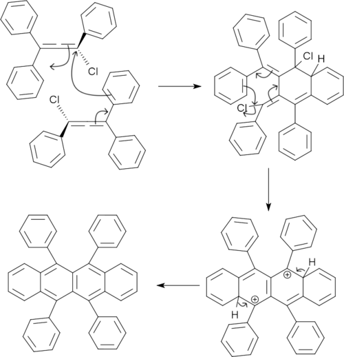 The resulting chloroallene undergoes dimerization and dehydrochlorination to give rubrene.[10]