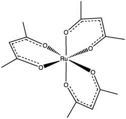 Ruthenium(III) acetylacetonate is a coordination complex with the formula Ru(O2C5H7)3. O2C5H7− is the ligand called acetylacetonate. This compound exists as a dark red solid that is soluble in most organic solvents.[3] It is used as a precursor to other compounds of ruthenium.