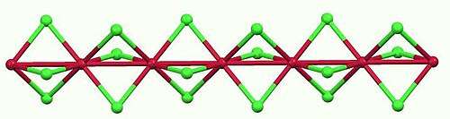 Anhydrous ruthenium(III) chloride is usually prepared by heating powdered ruthenium metal with chlorine. In the original synthesis, the chlorination was conducted in the presence of carbon monoxide, the product being carried by the gas stream and crystallising upon cooling.[1][2] Two polymorphs of RuCl3 are known. The black α-form adopts the CrCl3-type structure with long Ru-Ru contacts of 346 pm. This polymorph has honeycomb layers of Ru3+ which are surrounded with an octahedral cage of Cl− anions. The ruthenium cations are magnetic residing in a low-spin J~1/2 ground state with net angular momentum L=1.[3][4] Layers of α-RuCl3 are stacked on top of each other with weak Van der Waals forces. These can be cleaved to form mono-layers using scotch tape.[5]