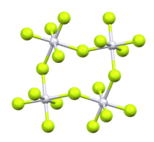 Ruthenium pentafluoride is the inorganic compound with the empirical formula RuF5. This green volatile solid has rarely been studied but is of interest as a binary fluoride of ruthenium, i.e. a compound containing only Ru and F. It is sensitive toward hydrolysis. Its structure consists of Ru4F20 tetramers, as seen in the isostructural platinum pentafluoride. Within the tetramers, each Ru adopts octahedral molecular geometry, with two bridging fluoride ligands.[1]
