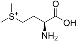 S-Methylmethionine (SMM) is a derivative of methionine with the chemical formula (CH3)2S+CH2CH2CH(NH3+)CO2−. This cation is a naturally-occurring intermediate in many biosynthetic pathways owing to the sulfonium functional group. It is biosynthesized from L-methionine and S-adenosylmethionine by the enzyme methionine S-methyltransferase. S-methylmethionine is particularly abundant in plants, being more abundant than methionine.[2]