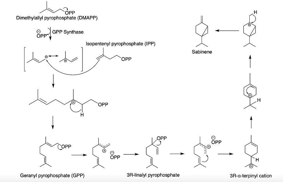 Sabinene, a bicyclic monoterpene, is present in the (+) and (-) enantiomers.[4] It is biosynthesized from the common terpenoid precursor, geranyl pyrophosphate (GPP) that undergoes polycyclization catalyzed by sabinene synthase (SabS).[4][5] GPP is formed from the terpenoid synthesis pathway with the starter units, isopentenyl pyrophosphate (IPP) and dimethylallyl pyrophosphate (DMAPP). The starter units, IPP and DMAPP, can be synthesized from either the mevalonate (MVA) or the methylerythritol 4-phosphate (MEP) pathway.[4] With the head-to-tail condensation of IPP and DMAPP catalyzed by GPP synthase, GPP is formed. Sabinene synthase (SabS) then catalyzes the ionization and isomerization of GPP to form 3R-linalyl pyrophosphate.[4][6] Further ionization and cyclization results in the formation of sabinene.