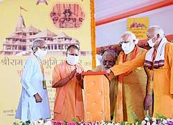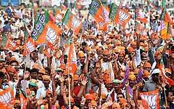 The Bharatiya Jana Sangh and its successor Bharatiya Janata Party (BJP) both used saffron as their colour. The BJP used a saffron lotus on its flag, along with a green side band that possibly reflected an attempted image of accommodation with Islam.[25] The Vishva Hindu Parishad (VHP), a Hindutva organisation affiliated with the RSS, also used saffron as its predominant colour, with its ascetic leaders clad in saffron robes and lay leaders wearing saffron scarves.[26] During the Ram Rath Yatra movement in 1990, the VHP and its affiliate Bajrang Dal distributed saffron flags and saffron headbands to their followers by the millions.[27][28][29]