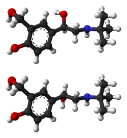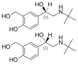 ![]() Salbutamol (top), (R)-(−)-salbutamol (center) and (S)-(+)-salbutamol (bottom) | |