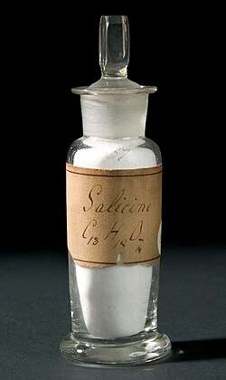 Salicin is found in the bark of and leaves of willows, poplars and various other plants.[5] Derivates are found in castoreum. Salicin from meadowsweet was used in the synthesis of aspirin (acetylsalicylic acid),[6] in 1899 by scientists at Bayer. Salicin tastes bitter like quinine.[7]