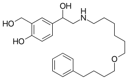 Salmeterol is a long-acting β2 adrenergic receptor agonist (LABA) used in the treatment and prevention of asthma symptoms and control of chronic obstructive pulmonary disease (COPD) symptoms.[2] Symptoms of bronchospasm include shortness of breath, wheezing, coughing and chest tightness. It is also used to prevent breathing difficulties during exercise (exercise-induced bronchoconstriction).[3]