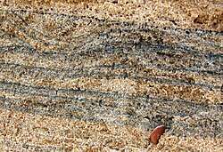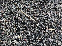 The exact definition of sand varies. The scientific Unified Soil Classification System used in engineering and geology corresponds to US Standard Sieves, and defines sand as particles with a diameter of between 0.074 and 4.75 millimeters.[5] By another definition, in terms of particle size as used by geologists, sand particles range in diameter from 0.0625 mm (or 116 mm) a volume of approximately 0.00012 cubic millimetres, to 2 mm, a volume of approximately 4.2 cubic millimetres, the difference in volumes being 34,688 measures difference.[6] Any particle falling within this range of sizes is termed a sand grain. Sand grains are between gravel (with particles ranging from 2 mm up to 64 mm by the latter system, and from 4.75 mm up to 75 mm in the former) and silt (particles smaller than 0.0625 mm down to 0.004 mm). The size specification between sand and gravel has remained constant for more than a century, but particle diameters as small as 0.02 mm were considered sand under the Albert Atterberg standard in use during the early 20th century. The grains of sand in Archimedes' The Sand Reckoner written around 240 BCE, were 0.02 mm in diameter. A 1938 specification of the United States Department of Agriculture was 0.05 mm.[7] A 1953 engineering standard published by the American Association of State Highway and Transportation Officials set the minimum sand size at 0.074 mm. Sand feels gritty when rubbed between the fingers. Silt, by comparison, feels like flour.