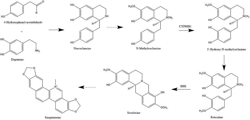 In plants, sanguinarine biosynthesis begins with 4-hydroxyphenylacetaldehyde and dopamine. These two compounds are combined to form norcoclaurine. Next, methyl groups are added to form N-methylcoclaurine. The enzyme CYP80B1 subsequently adds a hydroxyl group, forming 3'-hydroxy-N-methylcoclaurine. The addition of another methyl group transforms this compound into (S)-reticuline.[13]
