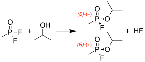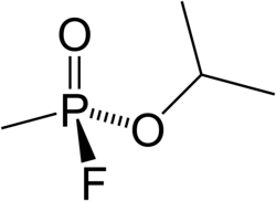 Sarin is a chiral molecule because it has four chemically distinct substituents attached to the tetrahedral phosphorus center.[26] The SP form (the (–) optical isomer) is the more active enantiomer due to its greater binding affinity to acetylcholinesterase.[27][28]