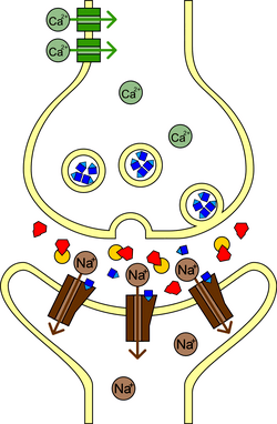 Sarin is a potent inhibitor of acetylcholinesterase,[12] an enzyme that degrades the neurotransmitter acetylcholine after it is released into the synaptic cleft. In vertebrates, acetylcholine is the neurotransmitter used at the neuromuscular junction, where signals are transmitted between neurons from the peripheral nervous system to muscle fibres. Normally, acetylcholine is released from the neuron to stimulate the muscle, after which it is degraded by acetylcholinesterase, allowing the muscle to relax. A build-up of acetylcholine in the synaptic cleft, due to the inhibition of acetylcholinesterase, means the neurotransmitter continues to act on the muscle fibre, so that any nerve impulses are effectively continually transmitted.